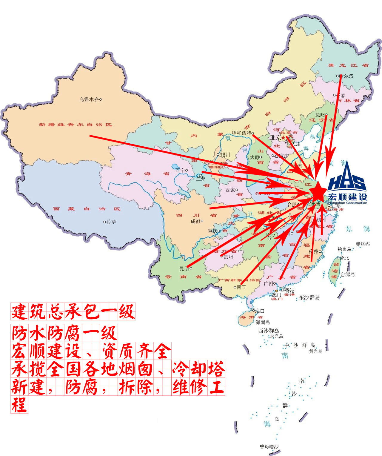現(xiàn)有施工工地及業(yè)績的城市有:|北京|天津|包頭|淮北|大連|青島|煙臺|廈門|寧夏|太原|呼和浩特|沈陽|長春|哈爾濱|南京|寧夏|寧夏|福州|南昌|寧夏|鄭州|武漢|長沙||廣州|南寧|海口|成都|貴陽|昆明|西安|蘭州|西寧|銀川|烏魯木齊|。